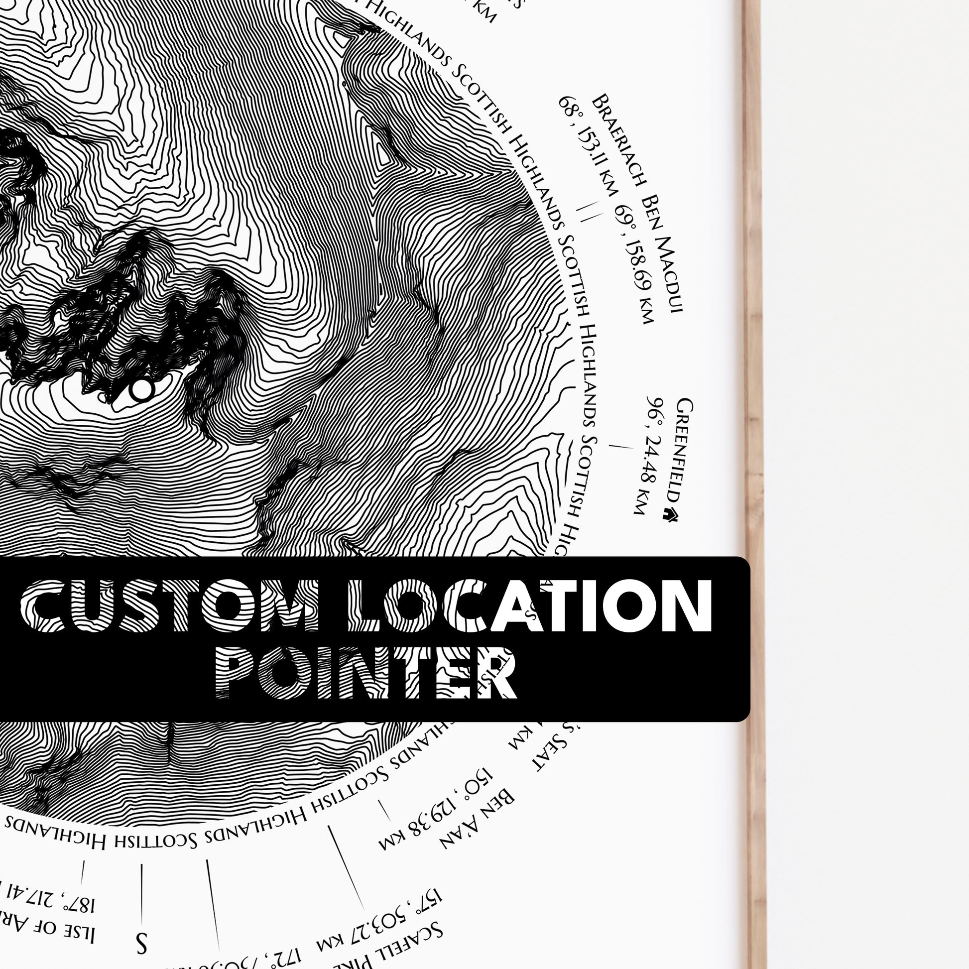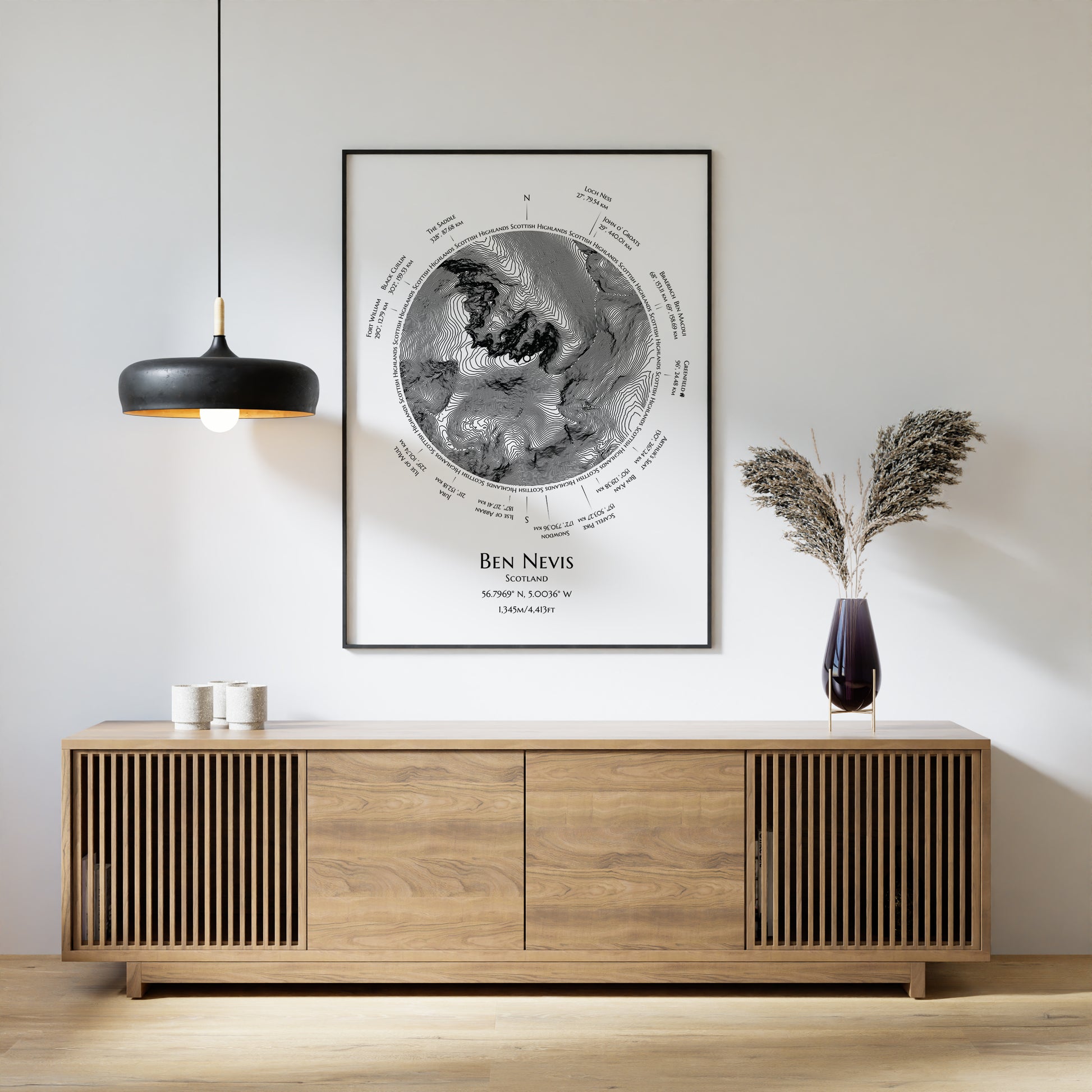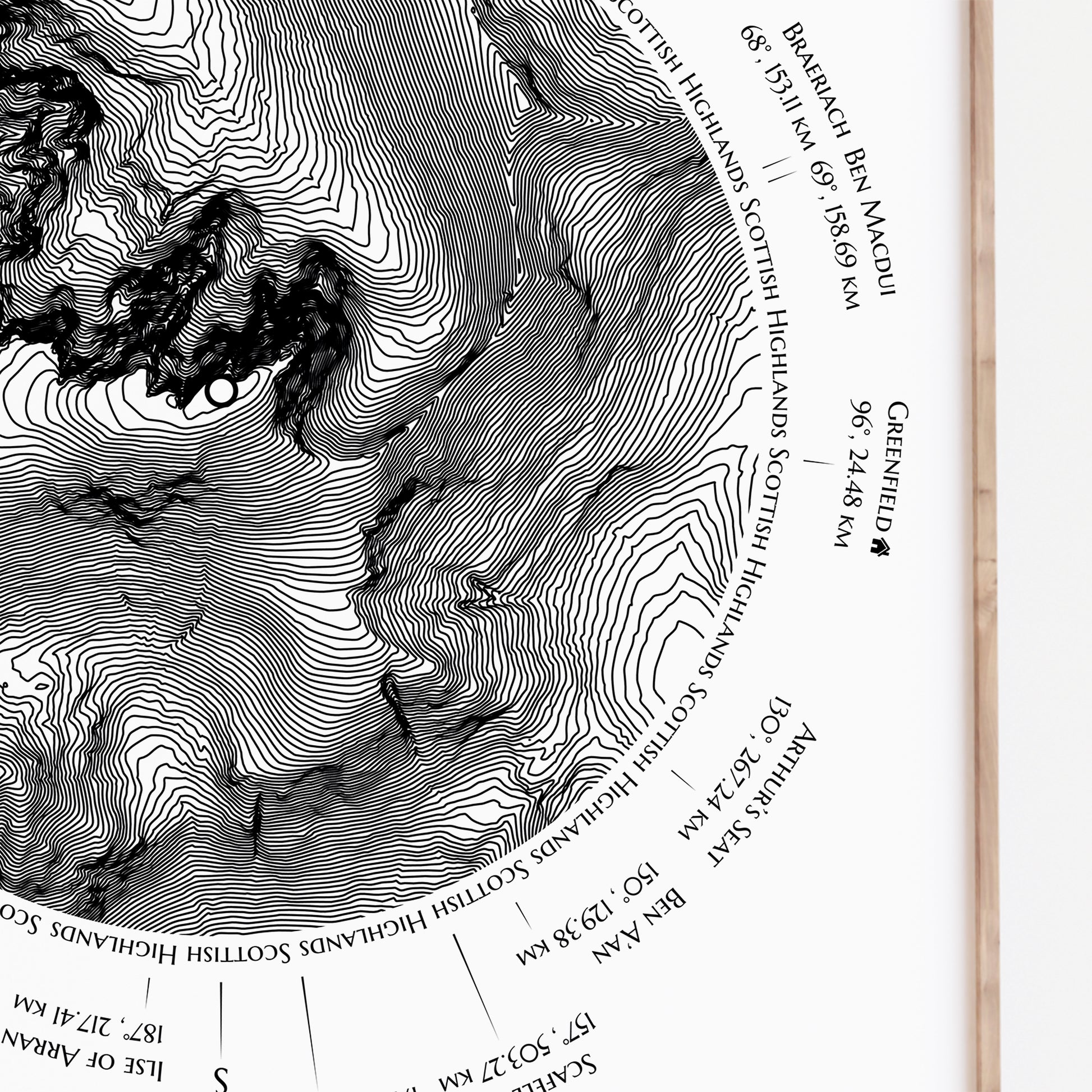 This print belongs to our Triangulation Series which offers a unique perspective into how the mountain sits, in distance and bearing, from neighbouring peaks, towns and iconic summits from across the UK. You can also add a personal bearing marker pointing to your home, or mountain of choice.