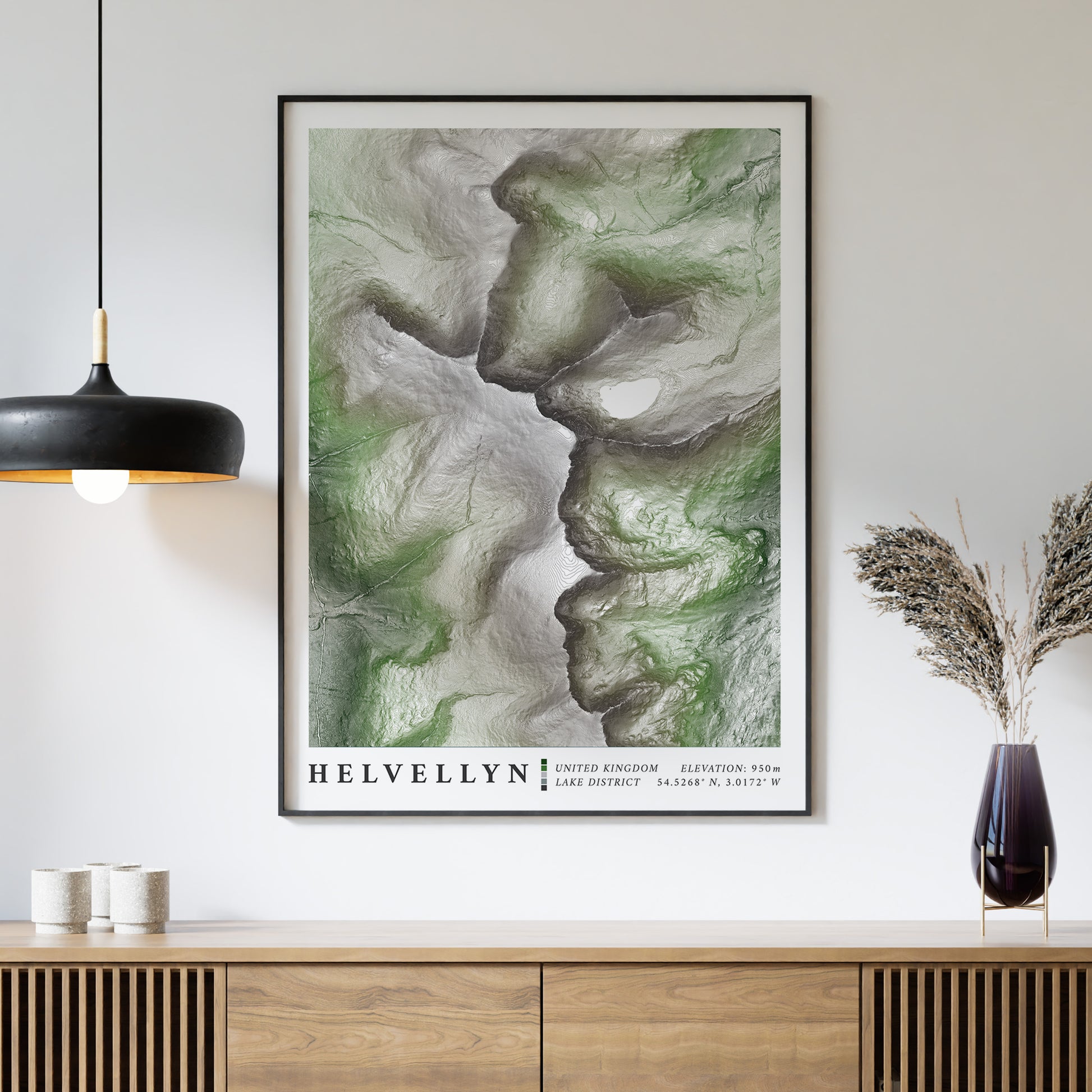 Helvellyn Range Topographic Contour Map Print featuring the 950m mountain peak of the Eastern Fells in the Lake District National Park. Forming a north–south line of mountains to the north of Ambleside, between the lakes of Thirlmere and Ullswater the range contains the iconic ridges of Striding Edge and Swirral Edge, along with neighbouring Bob Graham and Wainwright summits of Lower Man, Nethermost Pike and Dollywagon Pike.
