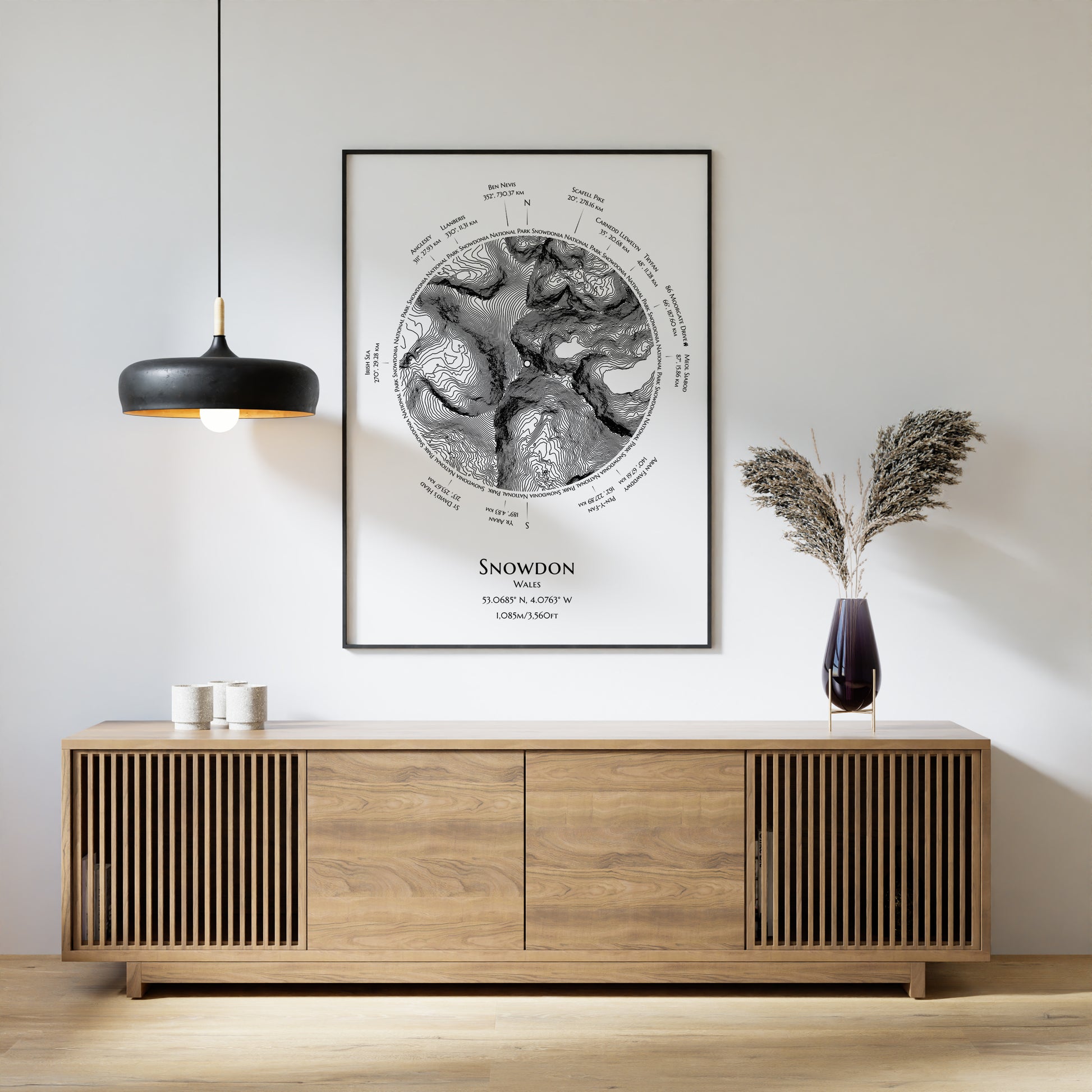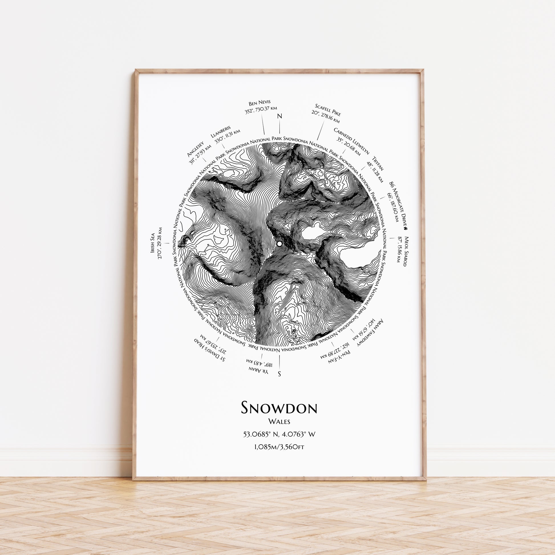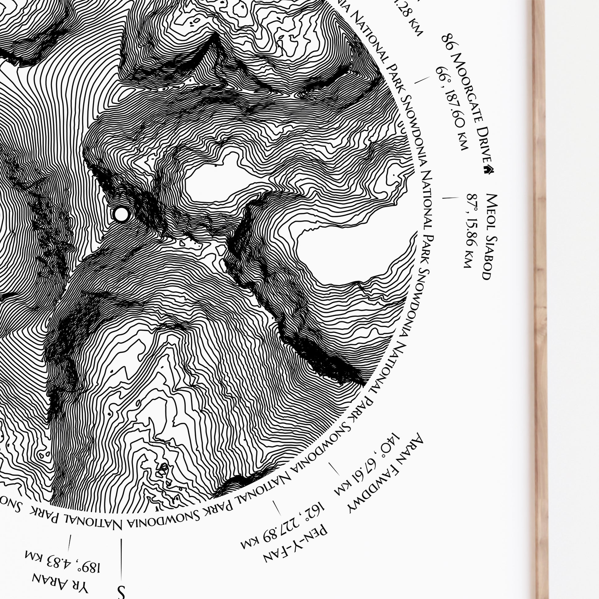 This print belongs to our Triangulation Series which offers a unique perspective into how the mountain sits, in distance and bearing, from neighbouring peaks, towns and iconic summits from across the UK. You can also add a personal bearing marker pointing to your home, or mountain of choice.