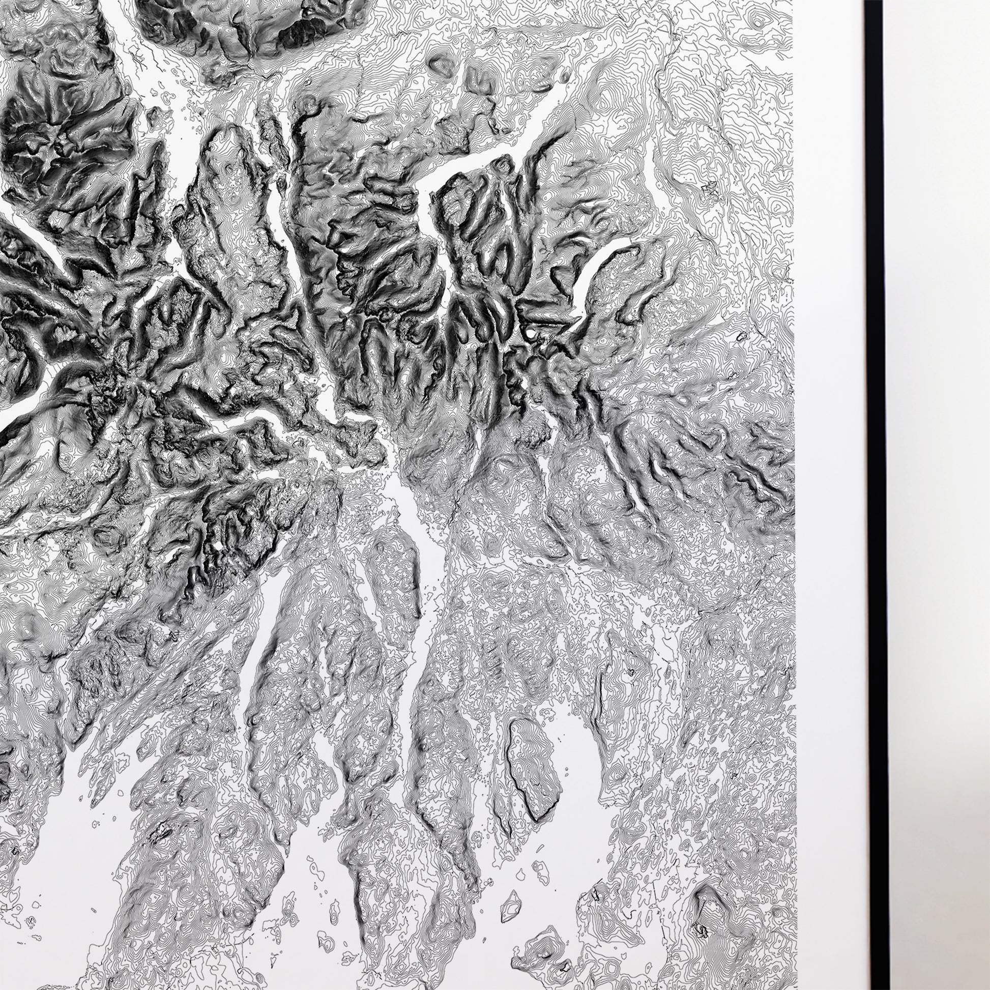 Our topographic map prints are created using high resolution LiDAR data which is processes and presented with the aim of opening a new perspective on natural landscapes. You may even be able to pick out your favourite hiking trails and mountain routes.