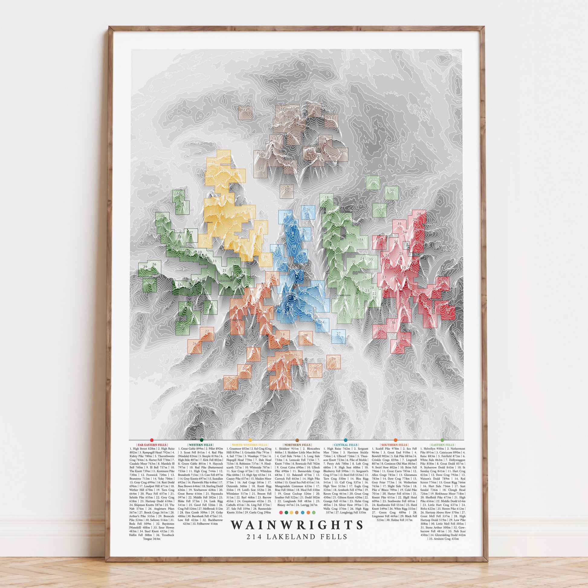 This Wainwrights poster print encompass the 214 Lakeland Fells categories by Alfred Wainwright. They trace the mountainous terrain of the Lake District through topographic contours. Broken down into the traditional categories, Southern Fells, Western Fells, Northern Fells, North Western Fells, Far Eastern Fells, Eastern Fells, this topographic contour map is intricately shaded and labelled to highlight all 214 Wainwright peaks.